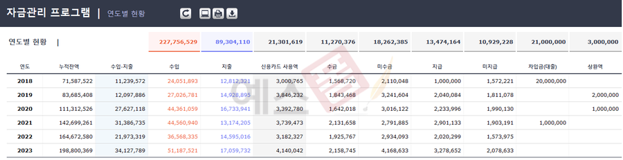 입력된 자금내역의 연도별 현황을 제공하는 시트입니다.