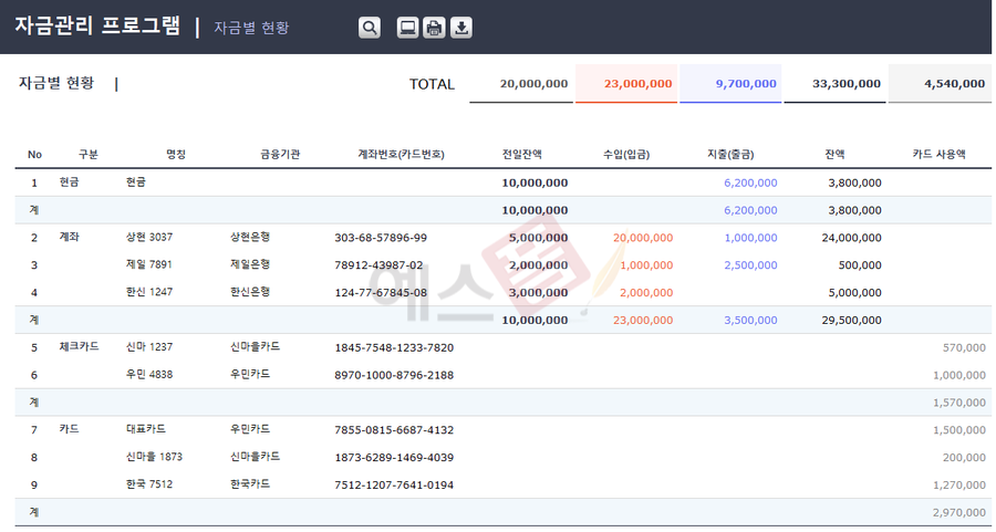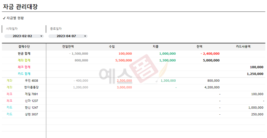 자금별(현금, 계좌, 체크, 카드) 현황을 조회할 수 있는 시트입니다.