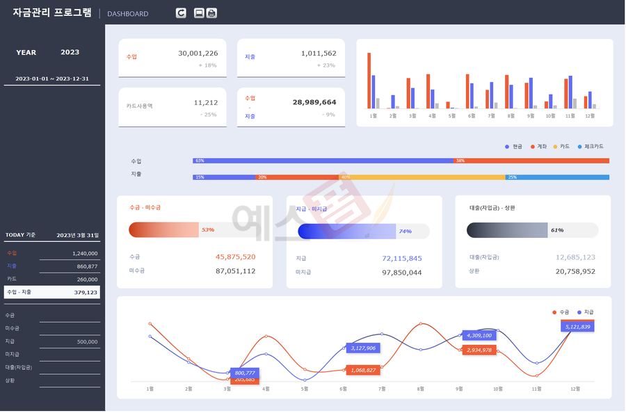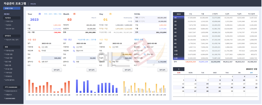 수입/지출, (미)수금/지급, 차입금(상환) 등의 회사 자금을 효율적으로 관리할 수 있도록 제작된 프로그램으로, 거래처별 · 자금별 현황, 차입금 현황, 월간 · 월별 · 연도별 현황 등 다양한 형태의 검색 기능을 제공합니다. 연간 세무달력이 자동으로 업데이트되며, 거래처 · 계정별 원장, 일계표(월계표) 조회 기능을 제공합니다. 자금일보(결산보고), 지출결의서 자동생성 기능을 제공하며 대시보드로 시각화된 데이터를 확인할 수 있습니다.