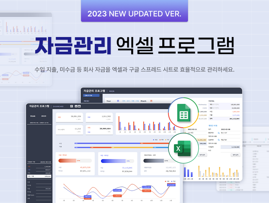 NEW 자금관리 엑셀프로그램은 현금/계좌/체크/신용카드 등 기본적인 자금관리부터 수금/지급, 미수금/미지급, 대출(차입금)/상환까지 한번에 관리할 수 있으며, 기존 사용자분들의 의견을 반영하여 자금일보&결산보고서, 지출결의서까지 자동으로 작성되는 기능에 추가로 세무일정 자동 업데이트까지! 모~든 기능을 담았습니다.