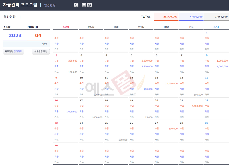 입력된 자금내역의 월간 현황 및 세무일정을 제공하는 시트입니다.