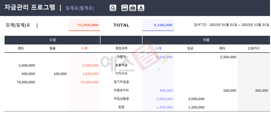 입력된 자금내역의 일계표(월계표)를 제공하는 시트입니다.