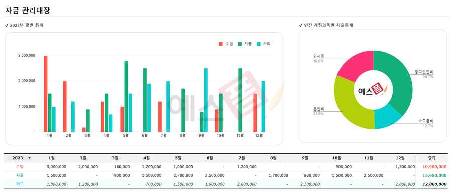 선택한 연도에 맞는 월별 · 계정과목별 지출 통계를 확인할 수 있는 시트입니다.