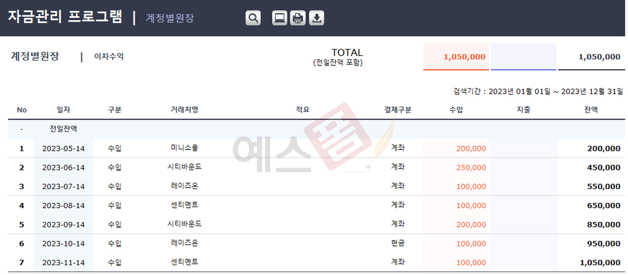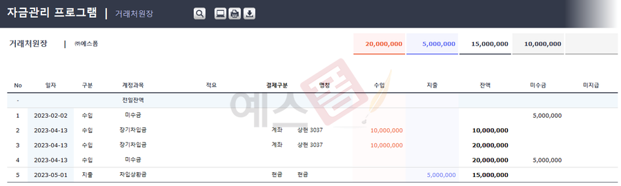 입력된 자금내역의 거래처 원장을 제공하는 시트입니다.