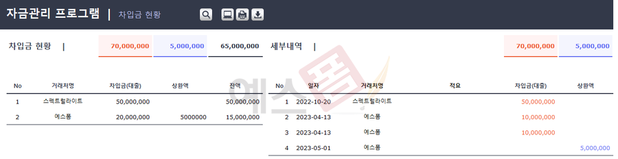 입력된 자금내역 중 차입금 현황을 제공하는 시트입니다.