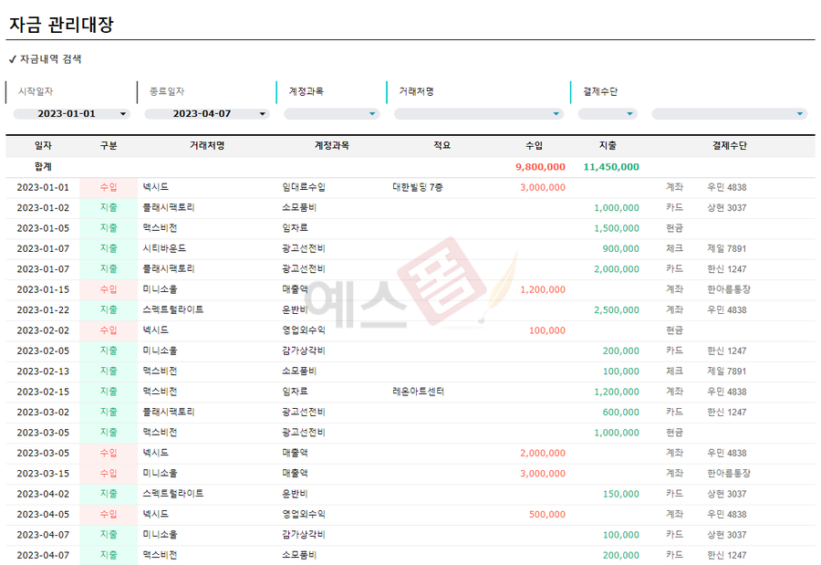 시작 · 종료일자, 계정과목, 거래처명, 결제수단 등 조건에 맞는 자금내역을 검색할 수 있는 시트입니다.