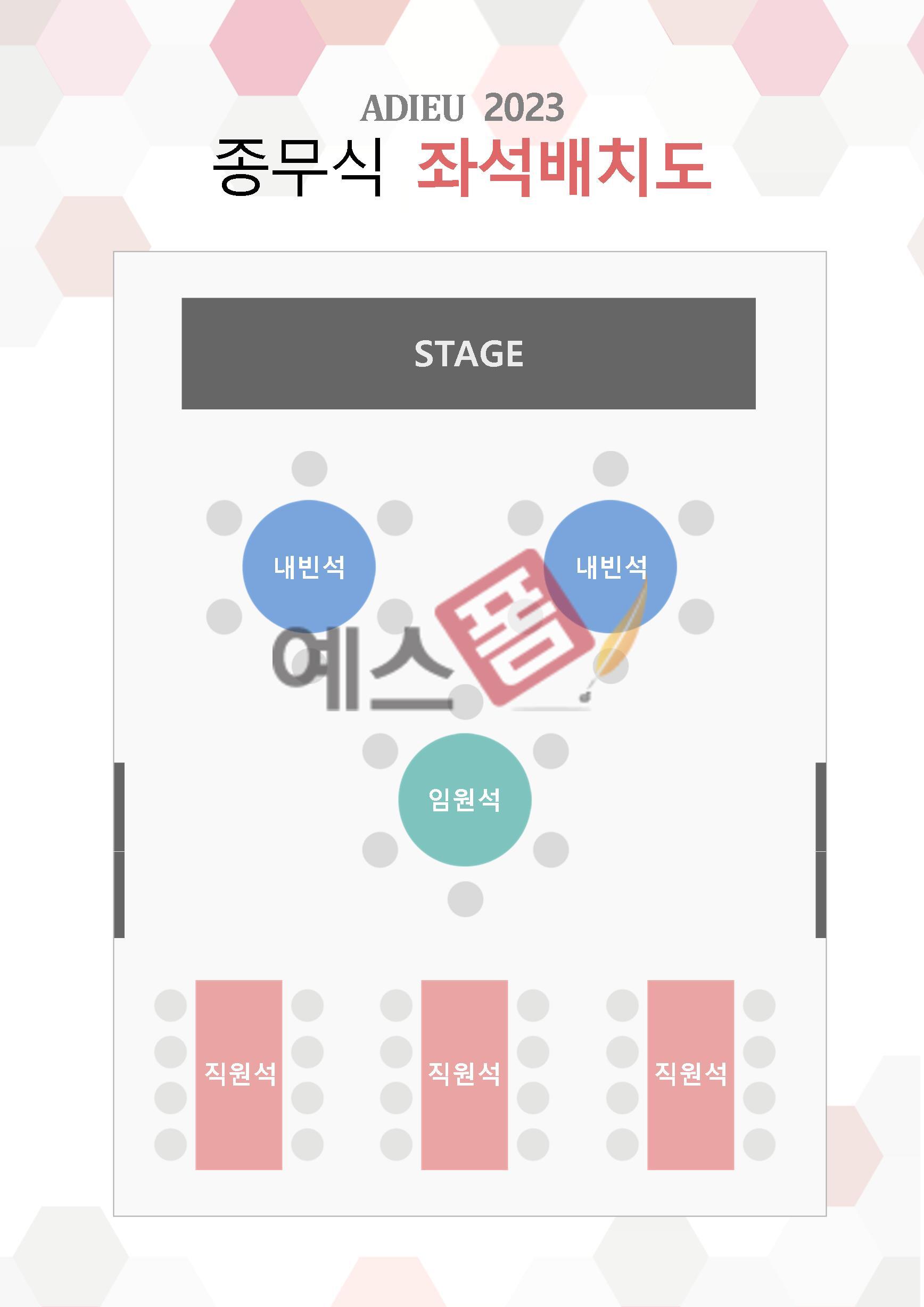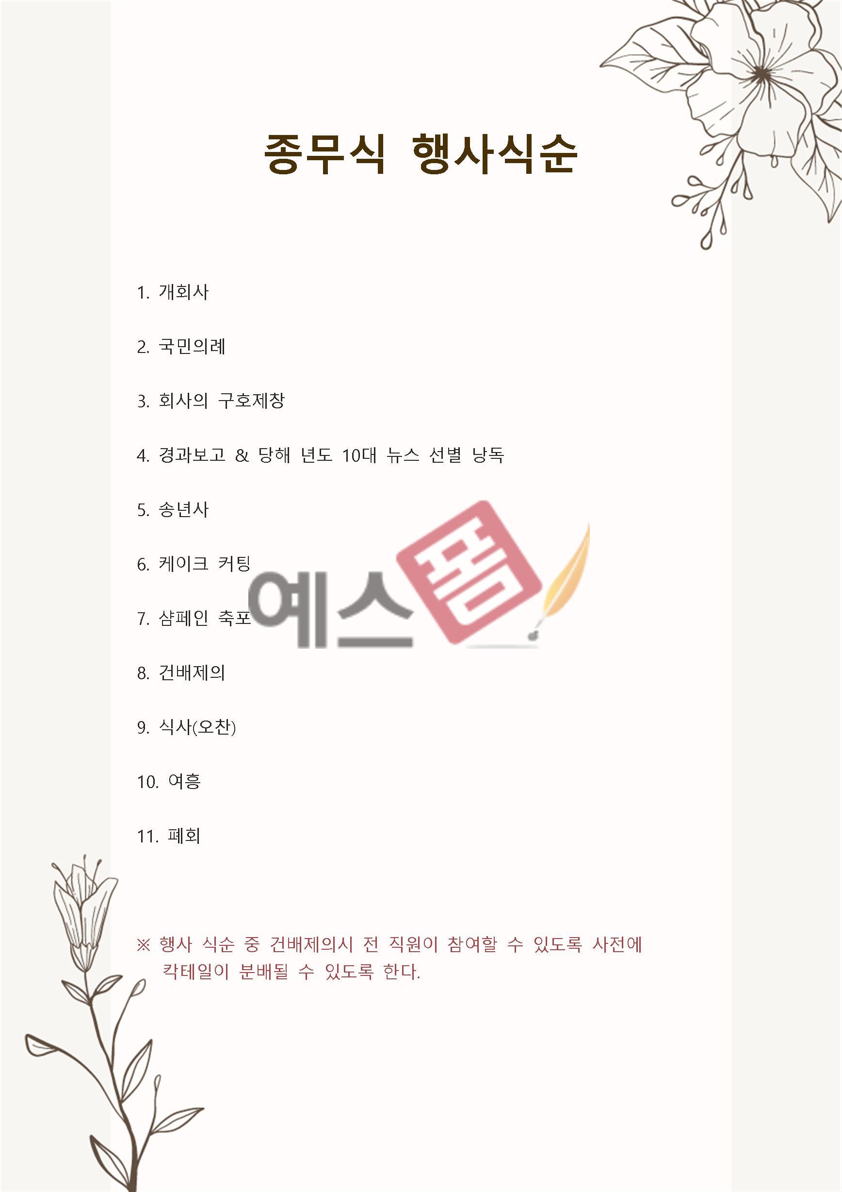 | [2023년] 종무식 회사대표 인사말 | [2023년] 종무식 행사식순 | [2023년] 종무식 좌석배치도(세로) |