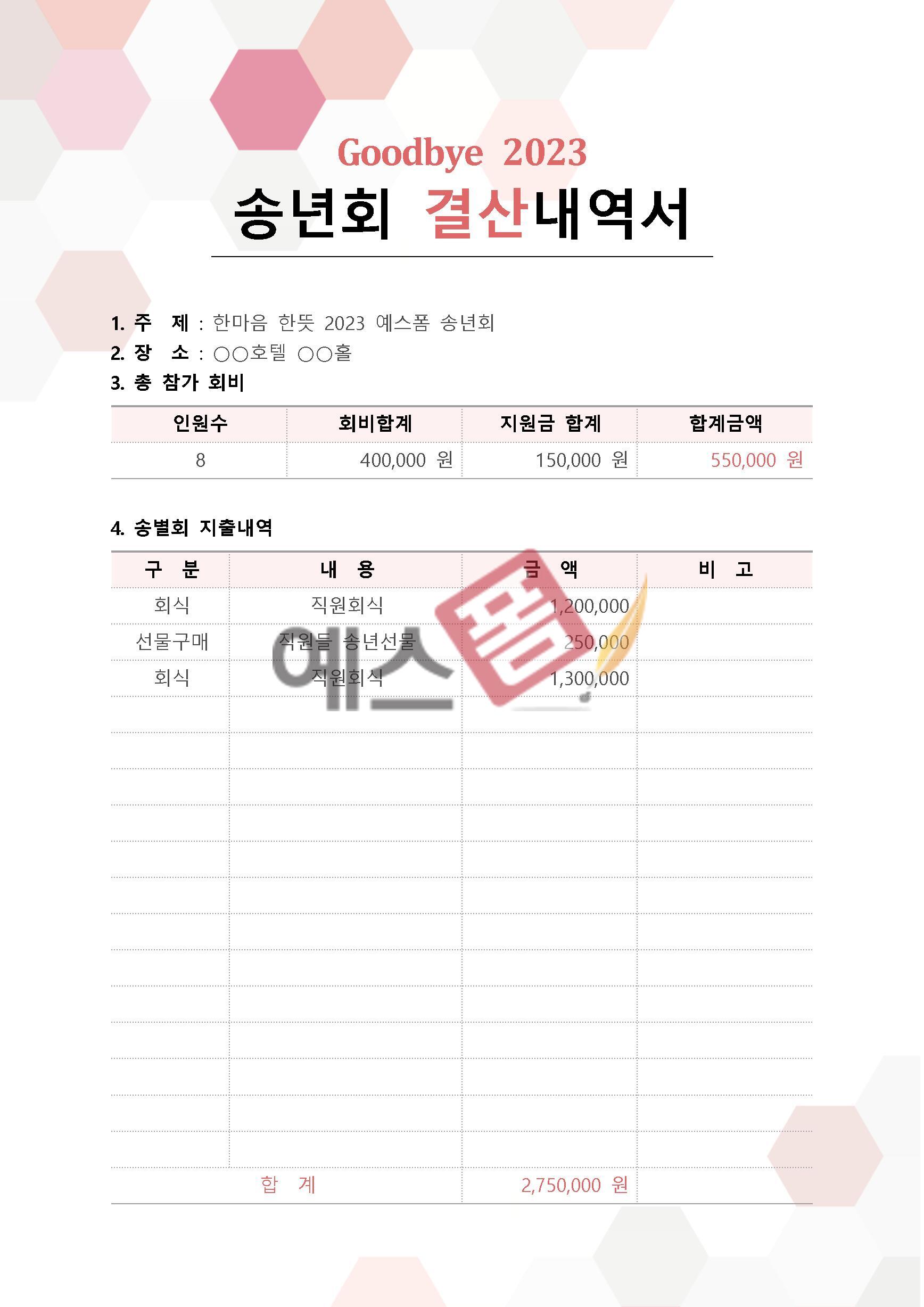 종무식을 통해 한 해의 성과를 축하하고, 감사의 마음을 전하는 것은 조직 문화에 긍정적인 영향을 미칩니다. 이렇듯 종무식은 조직 문화에 긍정적인 영향을 줄 수 있는데요. 금년도의 종무식을 더욱 빛나게 해 줄 이미지와 텍스트 등 디테일한 요소까지 신경 쓴 예스폼 양식을 활용해보세요. 간단한 편집만으로도 종무식과 송년회 이벤트를 기획하실 수 있습니다.