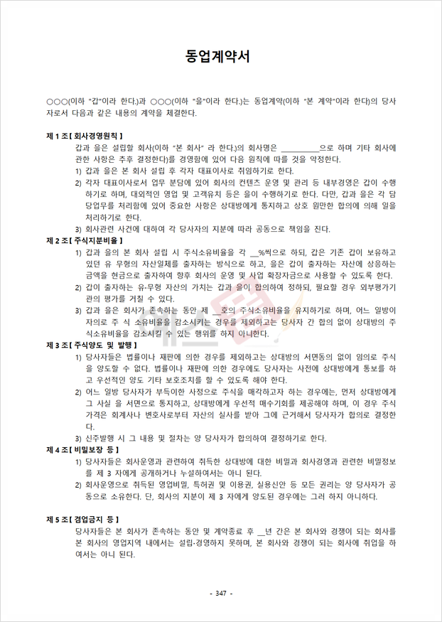 두 사람 이상이 공동으로 사업을 운영하기 위해 작성하는 동업계약서입니다. 각 동업자의 역할, 자본금 기여 비율, 이익 분배 방식 등을 규정하는 내용들이 들어갑니다.