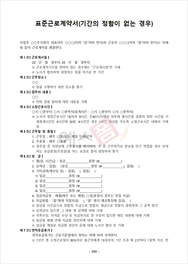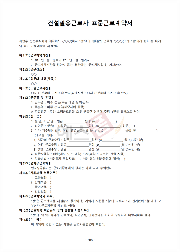 근로자와 사용자 간의 근로조건을 결정하는 계약서입니다. 근로시간, 임금, 휴가 등의 근로조건이 포함되며 근로기준법에 따라 반드시 작성되어야 하는 문서입니다. 근로자의 권리를 보호하고 사용자의 의무를 명확히 하는 역할을 하는 표준근로계약서입니다.