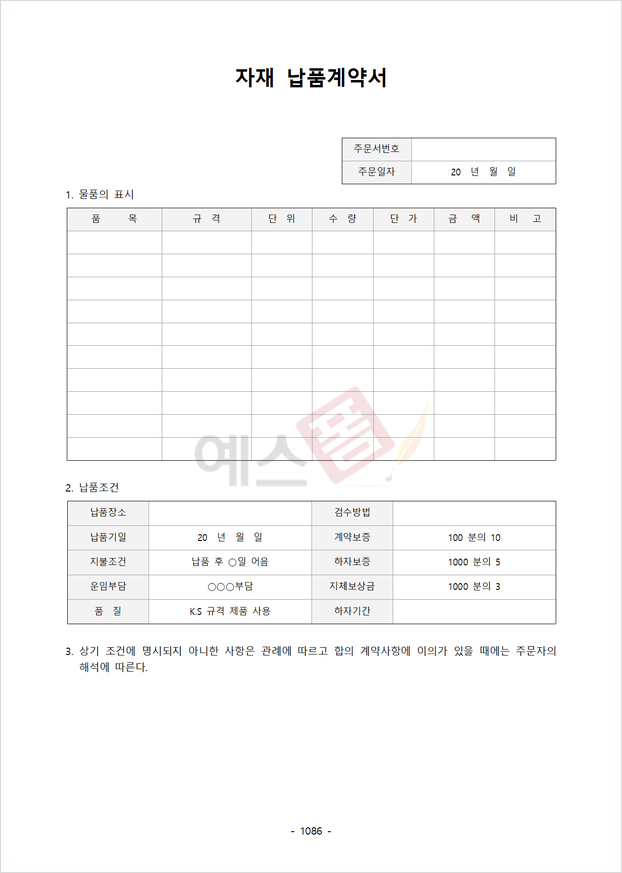 자재나 상품 등의 재산권을 제공하는 공급자와 그것을 받는 수급자 사이에서 체결됩니다. 상품의 종류, 수량, 가격, 납품 시기, 납품 방식 등을 명시하며, 공급자는 물품 인도의 의무를 부담하고 수급자는 대금지급의 의무를 부담한다는 내용의 납품계약서입니다.
