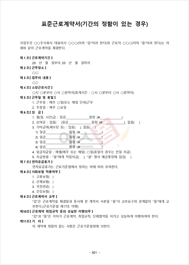 근로자와 사용자 간의 근로조건을 결정하는 계약서입니다. 근로시간, 임금, 휴가 등의 근로조건이 포함되며 근로기준법에 따라 반드시 작성되어야 하는 문서입니다. 근로자의 권리를 보호하고 사용자의 의무를 명확히 하는 역할을 하는 표준근로계약서입니다.