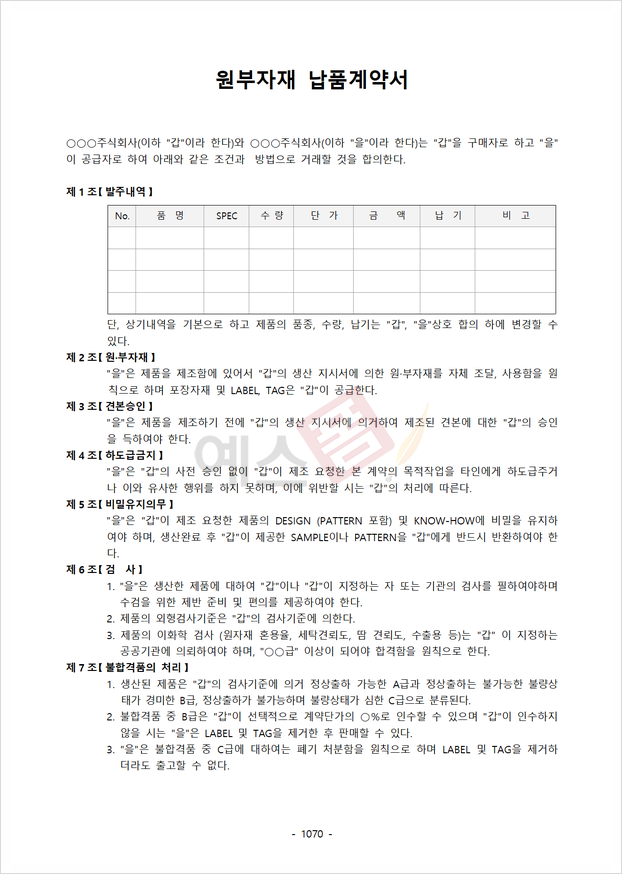 자재나 상품 등의 재산권을 제공하는 공급자와 그것을 받는 수급자 사이에서 체결됩니다. 상품의 종류, 수량, 가격, 납품 시기, 납품 방식 등을 명시하며, 공급자는 물품 인도의 의무를 부담하고 수급자는 대금지급의 의무를 부담한다는 내용의 납품계약서입니다.