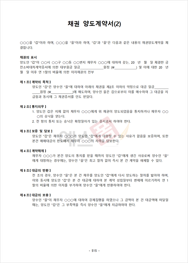 채권자가 자신이 가진 채권을 다른 사람에게 양도한다는 내용의 채권양도계약서입니다. 채권의 내용과 양도 조건 등을 명시하며, 채권자는 채권을 받아들인 사람에게서 채무자에 대한 채권을 양도하게 됩니다. 이를 통해 채권자는 채권의 회수를 보장받을 수 있습니다.