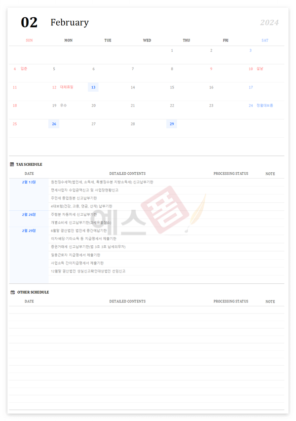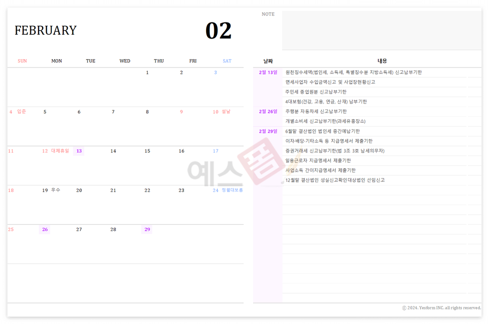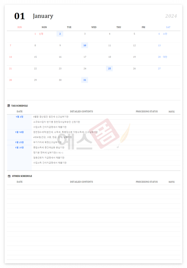 2024년 세무달력 일정관리 엑셀 템플릿 (세로형/가로형)