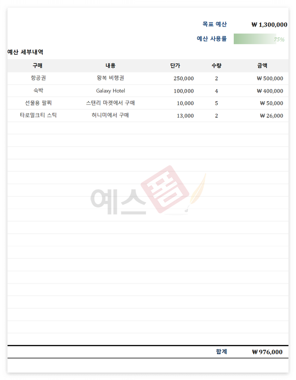 일주일간의 여행 일정을 달력과 함께 제공하여 여행계획을 세울 수 있는 여행일정 달력 템플릿입니다. 시간을 설정할 수 있으며, 공휴일 정보를 입력하면 해당 내역이 달력에 자동반영됩니다. 여행 예산표를 통해 여행의 세부 예산을 계획할 수 있습니다.