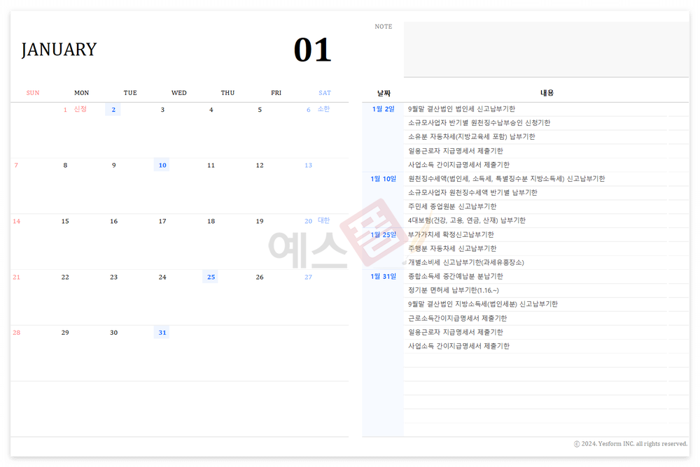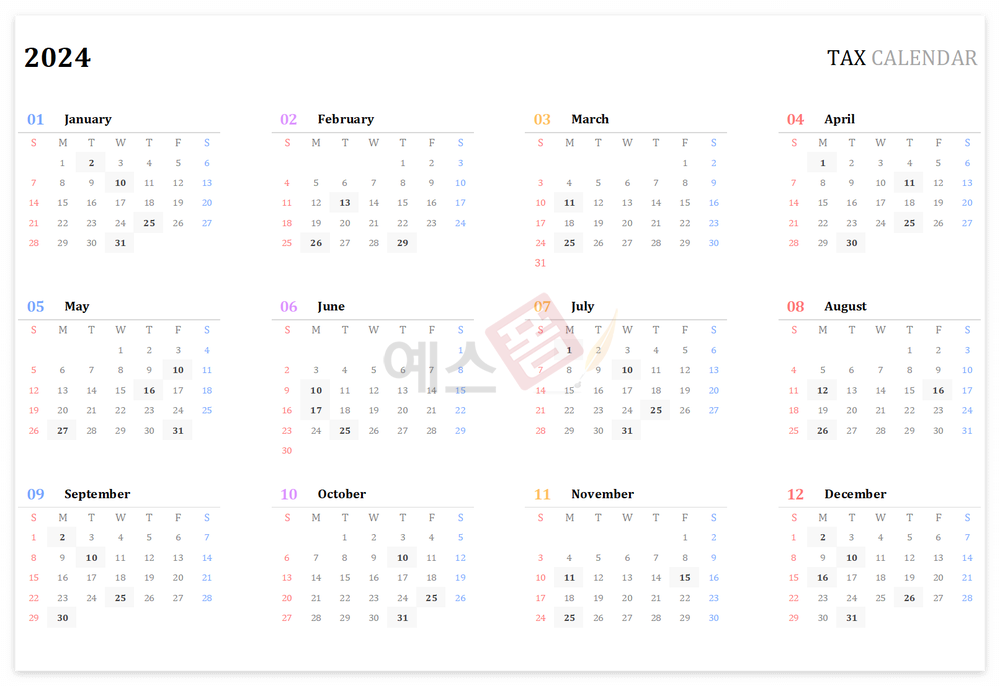 2024년 세무달력 일정관리 엑셀 템플릿 (세로형/가로형)