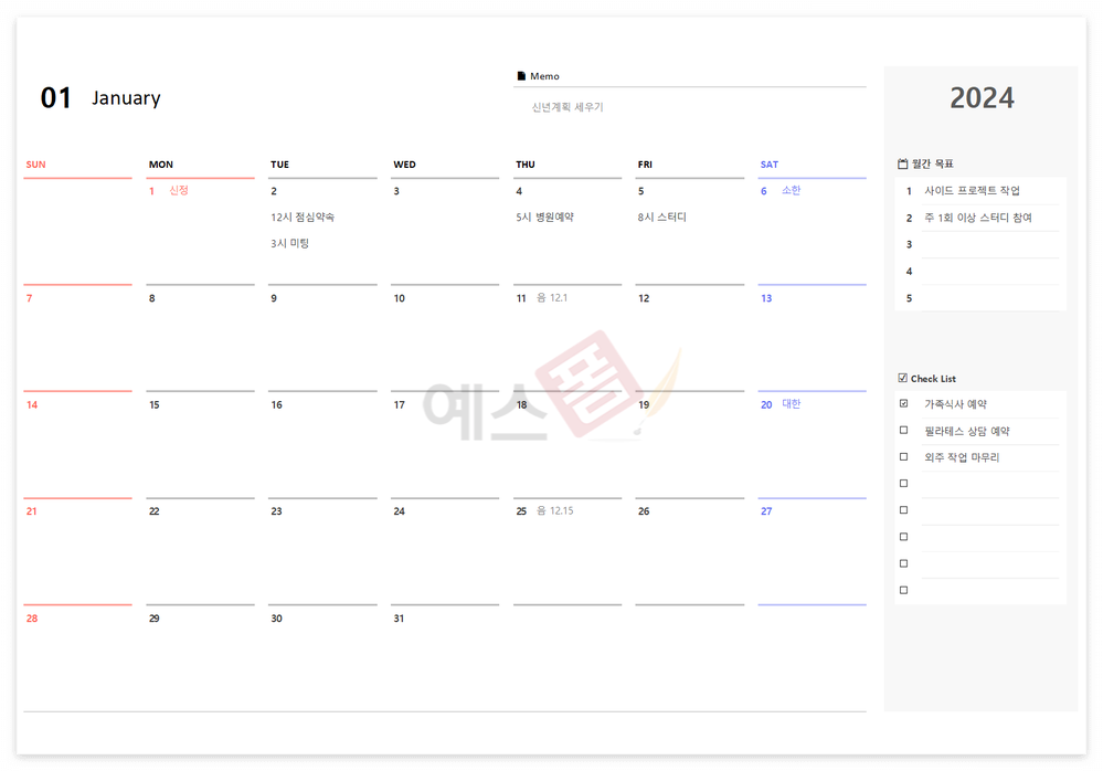 월별로 일정관리를 할 수 있는 2024년 월간달력 일정관리 템플릿입니다. 우측에 월간목표와 체크리스트를 작성할 수 있으며, 상단에 메모 입력이 가능하여 활용도 높게 사용이 가능합니다. 1. 1월