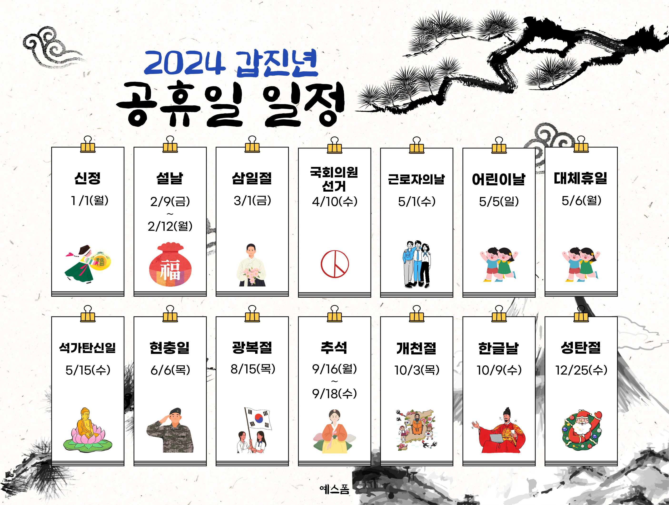 2024년공휴일은 국회의원선거, 근로자의날, 대체휴일을 포함하여 총 19개입니다.