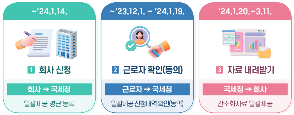 「간소화자료 일괄제공 서비스」 이용을 희망하는 회사는 근로자로부터 간소화자료 일괄제공 신청서를 제출받아 신청 근로자 명단을 ’24.1.14.까지 홈택스를 통해 등록하여야 하며, 근로자는 ’23.12.1.부터 ’24.1.19.까지 일괄제공 신청 내용에 대한 확인(동의) 절차를 진행하면 됩니다.