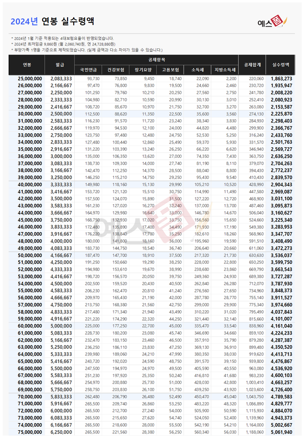 2024년 연봉 실수령액표는 2024년 1월 기준으로 적용되는 4대보험요율이 반영되었으며, 부양가족 1명을 기준으로 제작되었습니다.