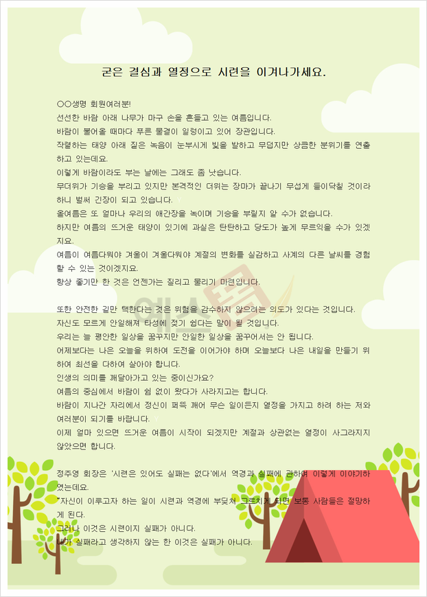 무더운 여름 힘들고 지치는 일산 굳은 결심과 열정으로 시련을 이겨나가라는 내용으로 대표이사가 보내는 여름 인사말 예시를 작성한 문구입니다. 자신의 위치, 업체 특성 등 알맞은 문구로 수정하여 활용할 수 있습니다.