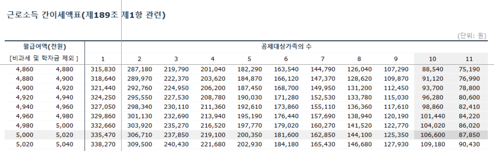 ① 근로소득 간이세액표 내 월급여 구간, 공제대상가족 10명, 11명이 만나는 구간을 찾습니다.