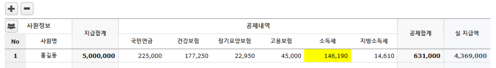 예스폼(엑셀공작소) 급여관리 엑셀 프로그램 급여대장에서도 확인 시 소득세가 자동으로 계산되는 것을 알 수 있습니다.