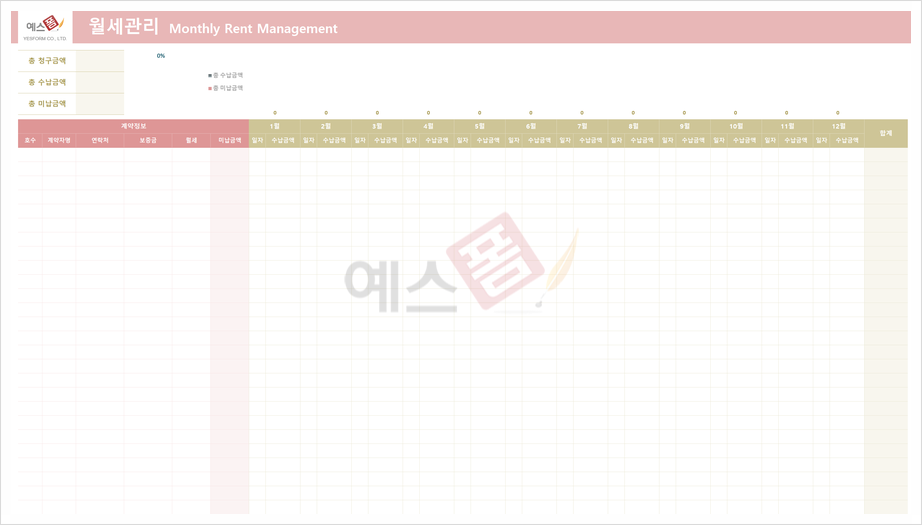 연간 수납내역 및 미납 내역 확인이 가능한 입주자 월세 수납관리 서식인 예스폼 월세 관리 Monthly Rent Management입니다. 세련된 레이아웃과 고급 기능 활용을 할 수 있고 엑셀을 처음 접하는 사람들도 쉽게 따라 할 수 있도록 콘텐츠별 사용 팁이 준비되어 있는데요. 미납 및 수납정보를 입력하면 상단의 그래프를 통해 월별 수납 현황이 제공되고 1년 단위로 사용할 수 있습니다.