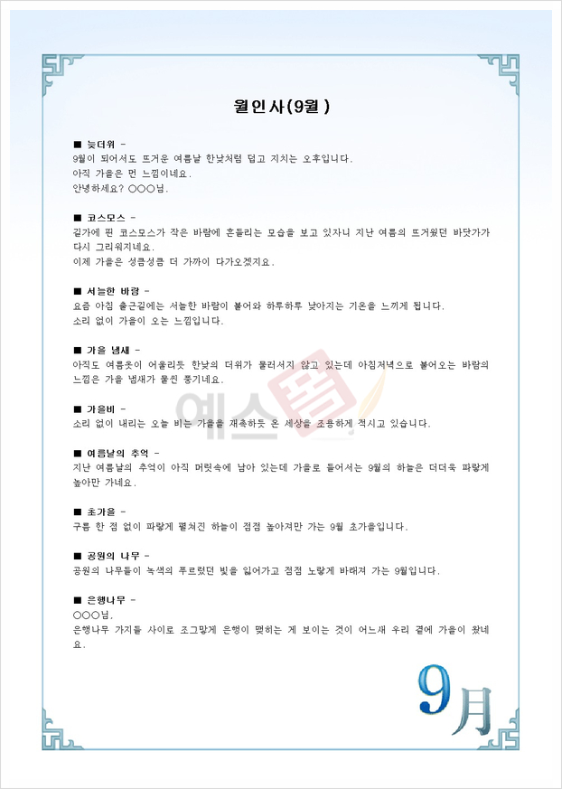 9월에 사용하기 좋은 인사말을 모아둔 예스폼 (인사말) 9월 계절 인사 (30개 예문 모음) (2024년)입니다.