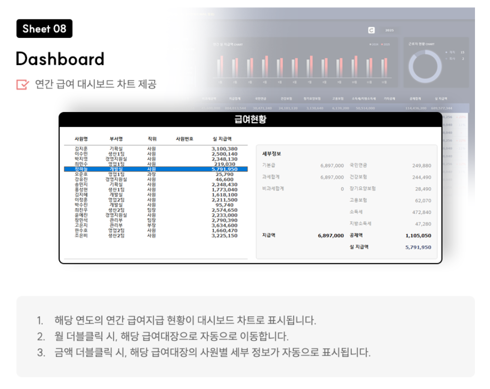 연간 급여 현황을 시각적인 차트로 제공합니다. 월별 급여 추이, 부서별 급여 비교, 급여 구성 항목별 분석 등을 직관적으로 확인할