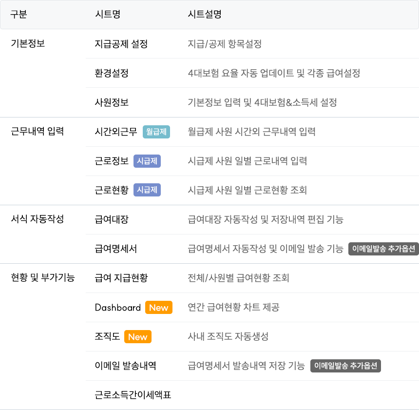 전문적인 급여프로그램은 급여 업무의 모든 과정을 체계적으로 관리할 수 있도록 다양한 시트로 구성되어 있습니다. 각 시트는 특정 기능에 특화되어 있어 업무 흐름에 따라 순차적으로 활용할 수 있습니다.