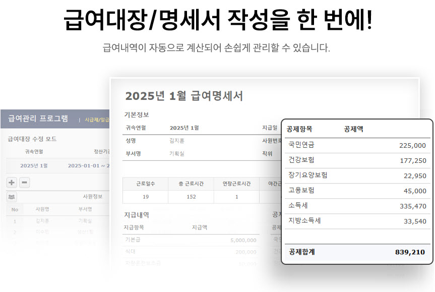급여관리 프로그램은 근로자의 급여 계산부터 4대보험 공제, 소득세 계산, 급여명세서 작성까지 급여 업무 전반을 자동화해주는 통합 솔루션입니다. 복잡한 수식이나 계산 과정을 수동으로 처리할 필요 없이, 기본 정보만 입력하면 모든 급여 관련 업무가 자동으로 처리되어 업무 효율성을 극대화할 수 있습니다.