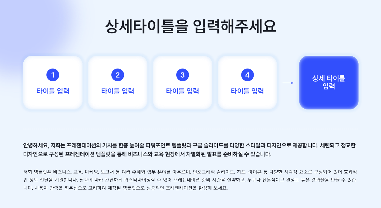 기업의 연간 사업 계획서를 체계적으로 정리하고 발표할 때 활용할 수 있는 템플릿입니다. 부드러운 블루 톤과 곡선형 요소를 사용하여 전문성과 친근함을 동시에 전달하며 시각적 집중도를 높