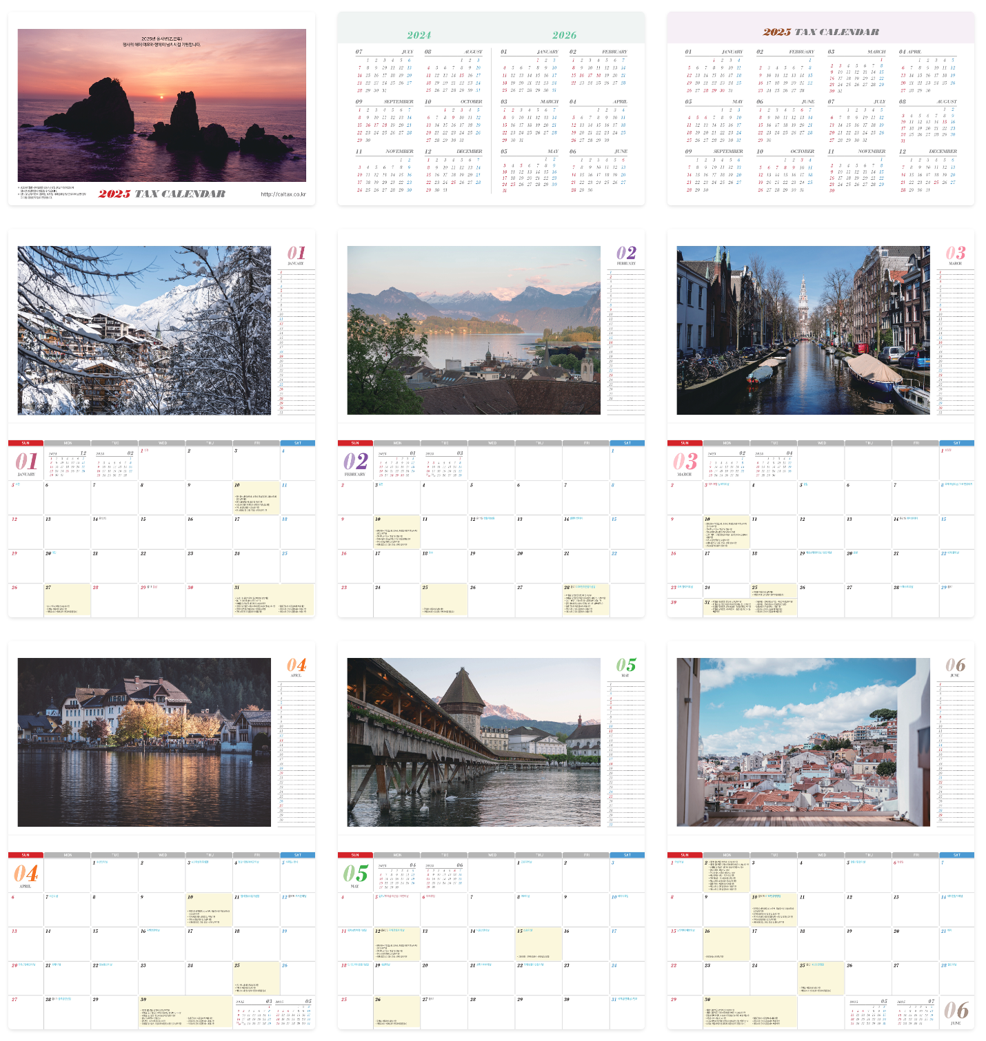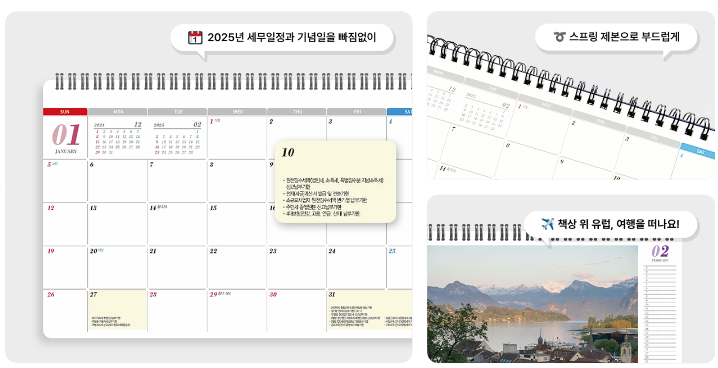 세무 캘린더에는 2025년의 중요한 연간 세무 일정뿐 아니라 기념일까지 빠짐없이 모두 담겨있어요. 세무 달력 하나로 세무 관련 일을 미리 준비하고 중요한 기한을 놓치지 않게 도와드려요. 탁상 달력을 펼치고 사용할 때 페이지가 쉽게 넘어가는 스프링 제본이 적용되어 있어 바쁜 업무 중에도 편리하게 사용할 수 있어요. 탁상 달력은 어떤 페이지를 펼치든 부드럽게 열리고 원하는 세무 일정을 쉽게 확인할 수 있답니다.