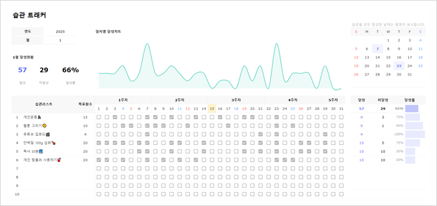 직관적인 대시보드 형식으로 목표를 한눈에 정리할 수 있습니다. 할 일 목록(To-Do List), 일정 관리, 습관 트래커 등을 하나의 페이지에서 종합적으로 활용할 수 있으며, 블록 시스템을 통해 원하는 형태로 커스터마이징도 가능합니다. 노션을 자주 활용하는 사용자라면 목표를 시각적으로 정리하고 실시간으로 업데이트할 수 있어 편리합니다.