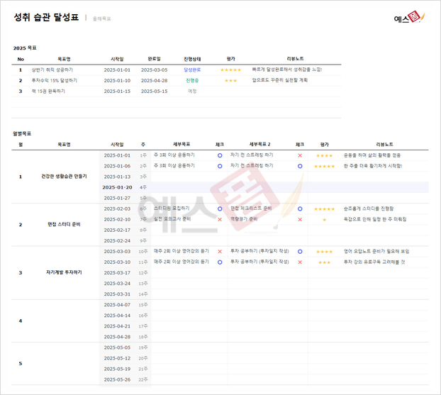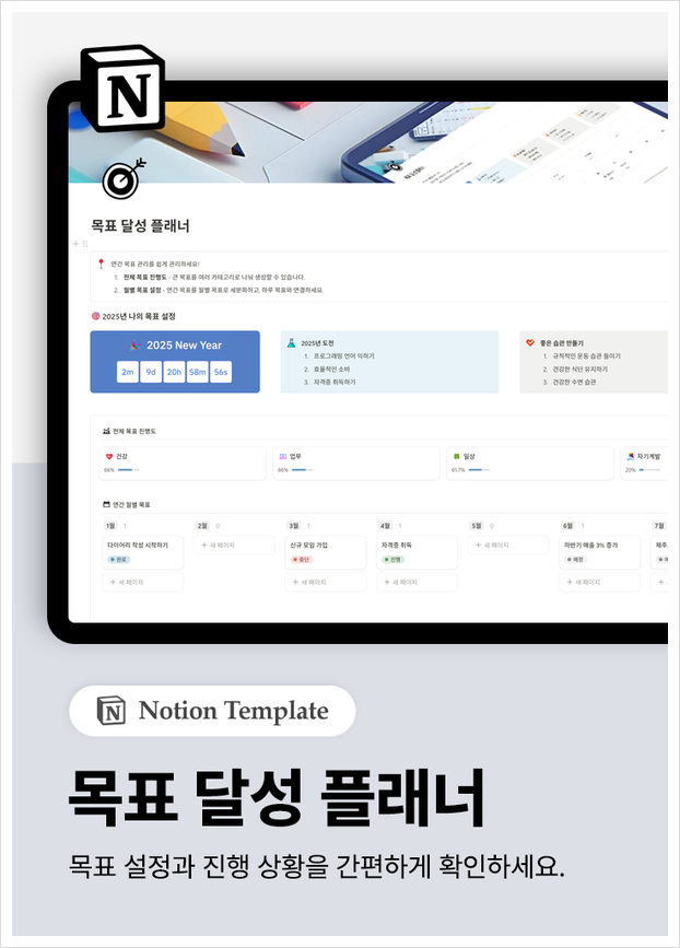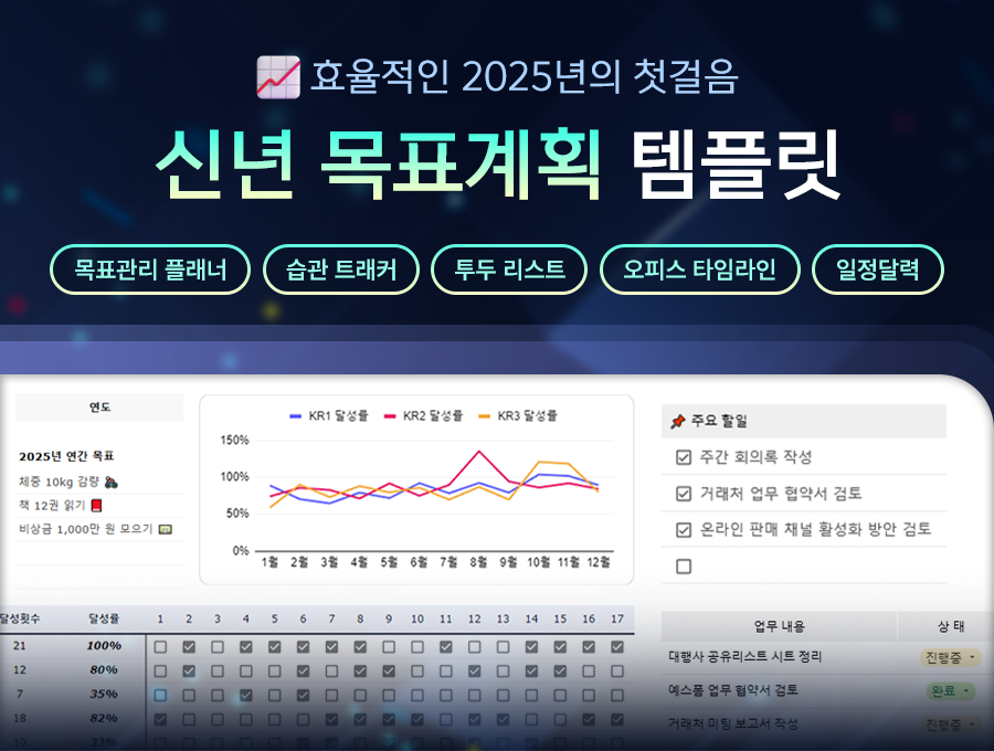 오늘은 2025년 신년 목표를 체계적으로 정리할 수 있는 다양한 폼의 신년 목표 계획 템플릿을 추천드릴 예정입니다. 연간 목표를 정리하는 양식부터 월별·주별 계획을 세울 수 있는 템플릿까지, 원하는 스타일에 맞춰 활용해 보세요. 2025년 신년 목표를 체계적으로 정리하기 위해 목표 설정 방식이나 활용 목적에 따라 적절한 템플릿을 선택하면 계획을 더욱 효과적으로 실행할 수 있습니다. 이번 글에서 구글 시트, 노션, PPT, 구글 닥스, 엑셀 등 다양한 양식의 신년 목표 계획 템플릿을 소개드릴 예정이니 참고해 보세요.