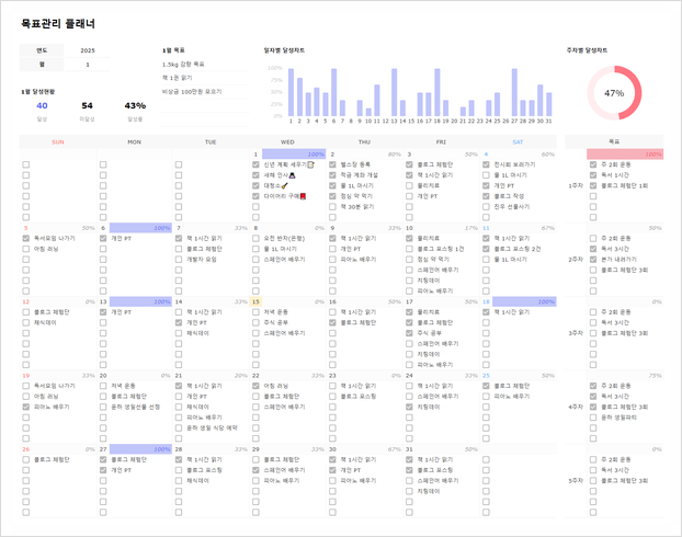 효과적인 목표 설정을 위해서는 연간 목표, 월간 계획, 세부 실행 계획 등을 정리할 수 있는 템플릿이 필요합니다. 한눈에 목표를 확인하고 실천 상황을 점검할 수 있도록 구성된 템플릿을 활용하면 목표 달성 확률이 훨씬 높아집니다.