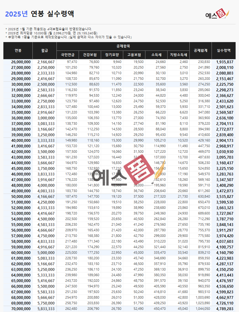 #2025년 실수령액 예시 (4대 보험 공제 기준)