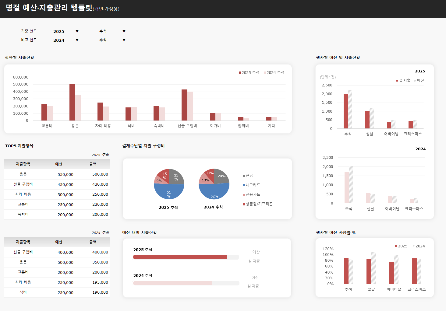 명절 예산·지출관리 템플릿(개인용)은 추석, 설날 등 명절마다 지출이 많아지는 일반 가정과 개인을 위해 제작되었습니다.명절에 발생하는 다양한 지출을 사전에 계획하고 실제 사용 내역을 기