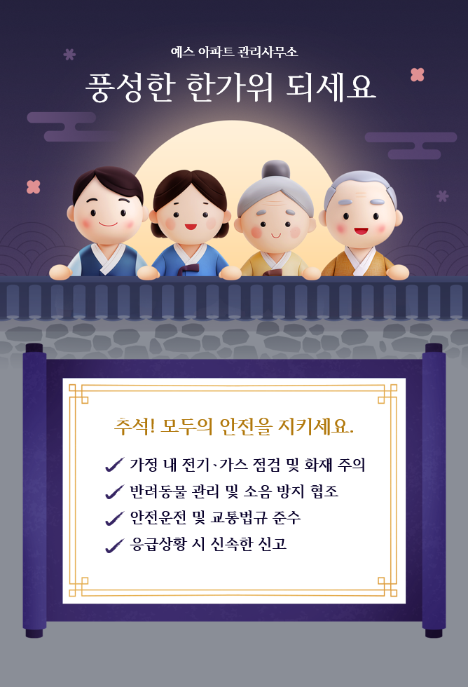 연휴 기간 소홀해지기 쉬운 기본 안전 관리 항목을 상기시켜 사고를 사전에 차단하는 것이 핵심입니다.주민 연휴 전 안전 점검 유도, 관리소 및 입주자 대표회의의 실무 지침, 비상 연락망 공유,