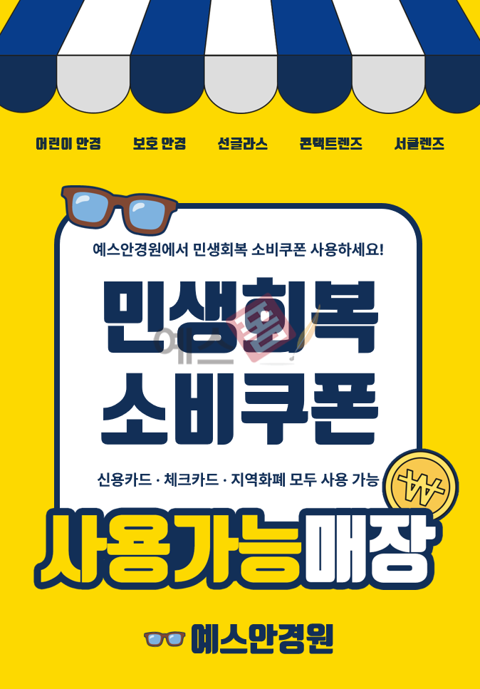 안경원 및 관련 업종에서 사용할 수 있는 민생회복 소비쿠폰 사용 안내문입니다. 소비자가 신용카드나 체크카드 및 지역화폐 등으로 소비쿠폰을 활용해 결제할 수 있음을 직관적으로 전달할 수