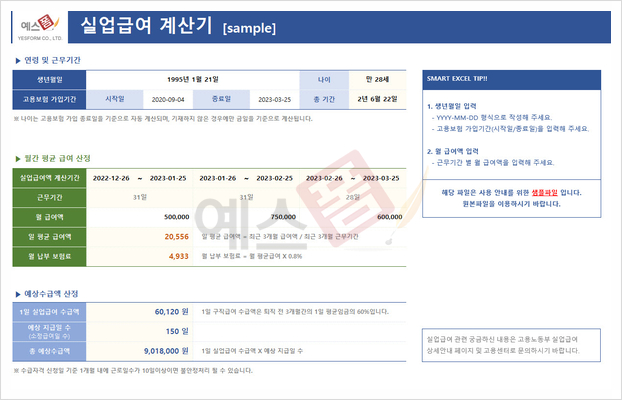 예스폼에서는 실업급여 예상 금액을 간편하게 계산할 수 있는 엑셀 프로그램입니다.