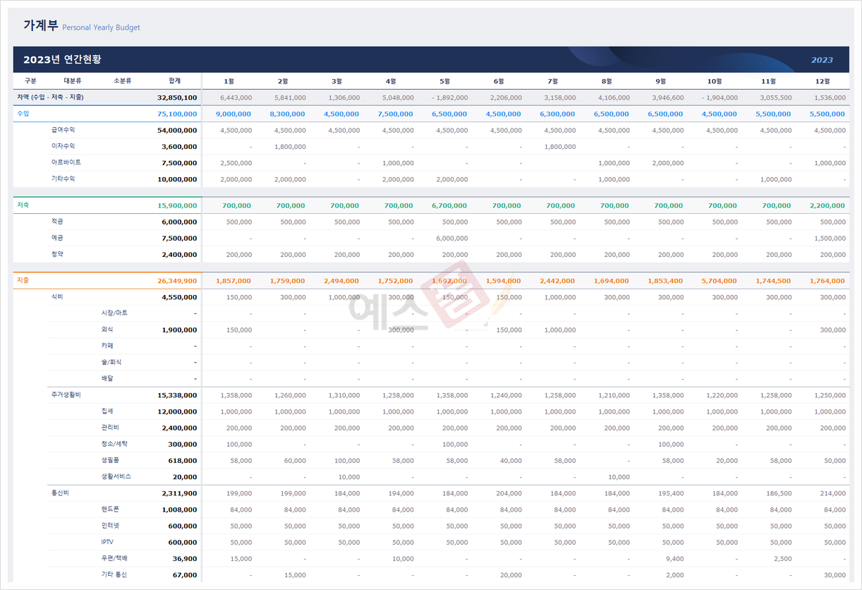 가계 수입/저축/지출 내역을 관리할 수 있는 예스폼 가계부 엑셀 프로그램입니다.