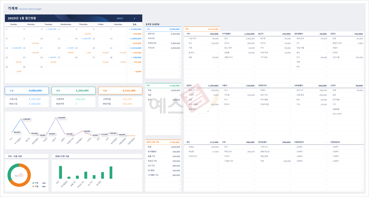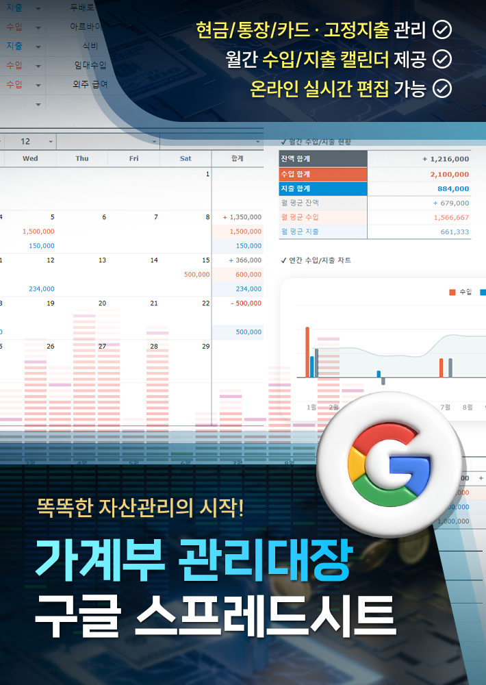 가계부 관리대장은 현금/통장 · 카드 · 고정지출을 관리할 수 있으며, 수입/지출 내역을 바탕으로 가계부를 편리하게 관리할 수 있는 구글 스프레드시트입니다. 이와 함께 월간 캘린더와 연간(월별) 수입/지출 현황표, 차트를 제공하여 계정과목별 수입/지출 현황 확인이 가능한 가계부 관리대장 구글 스프레드시트입니다.