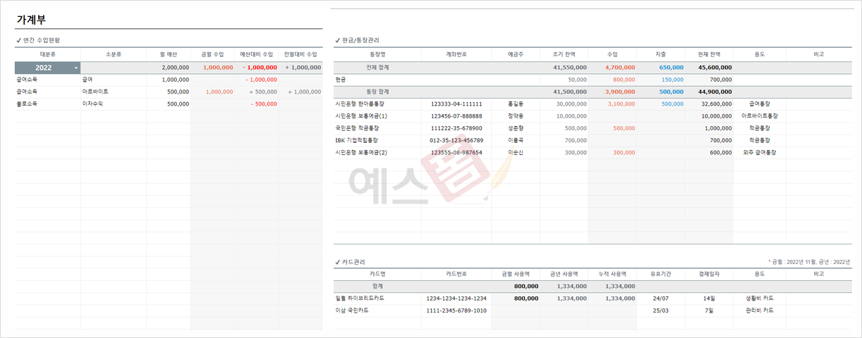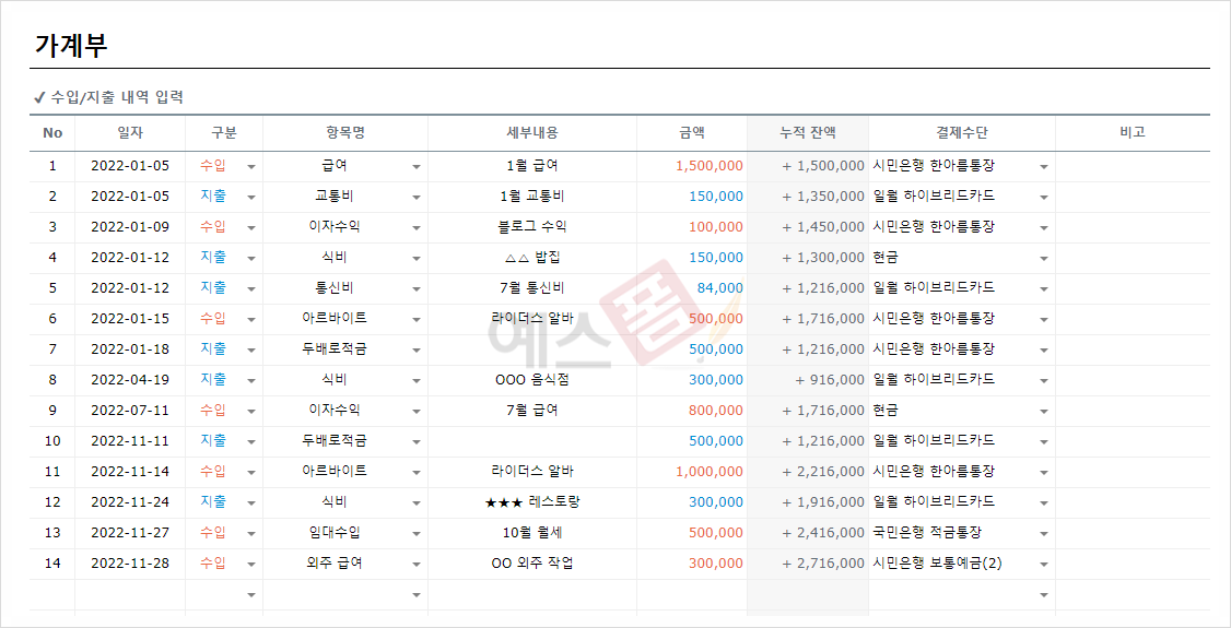 가계부 관리대장 구글 스프레드시트 - 예스폼 엑셀서식