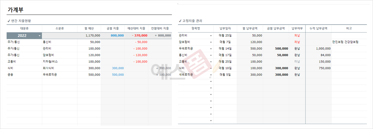 가계부 관리대장 구글 스프레드시트 - 예스폼 엑셀서식