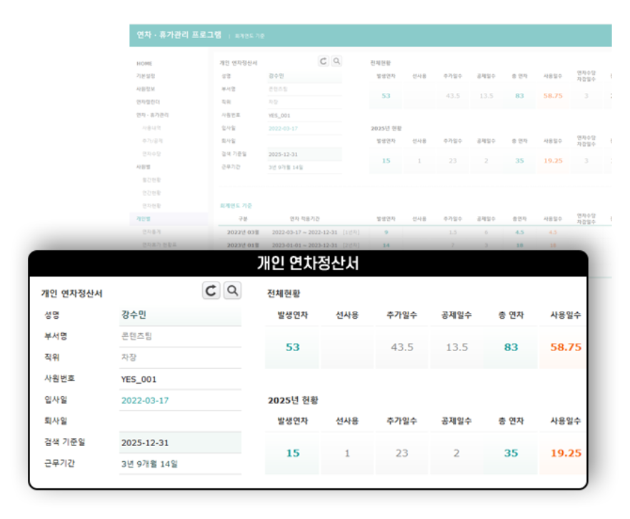 | 개인 연차정산서 | 기준일자별 연차정산서 조회 | |