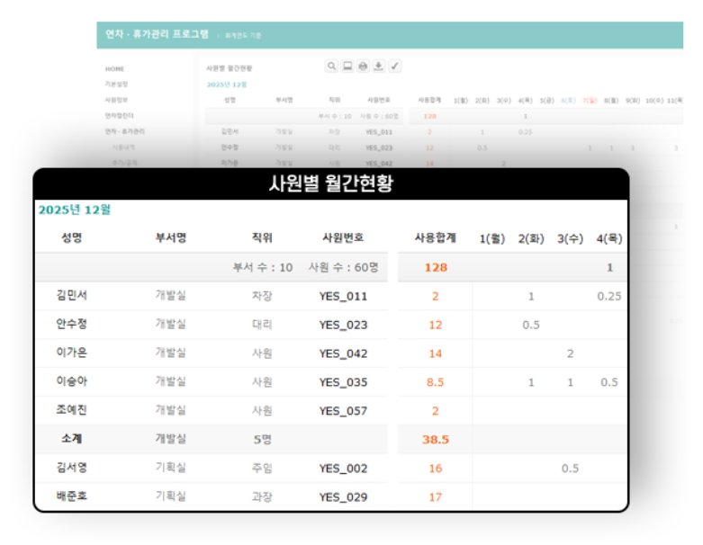 사원별 월간현황 | 연도별 월별 연차현황 |