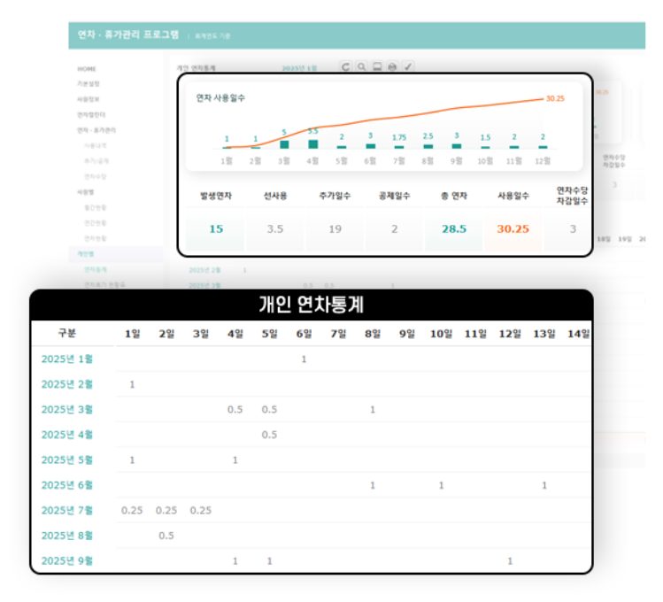 | 개인 연차통계 | 개인 연차통계 | |